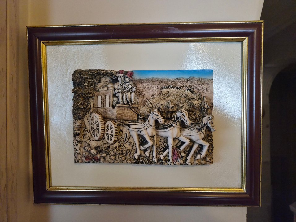 Çerçeveli kabartma tablo, at arabası sahnesini detaylı dokular ve rustik arka planla gösterir, tarihi bir atmosfer sunar.