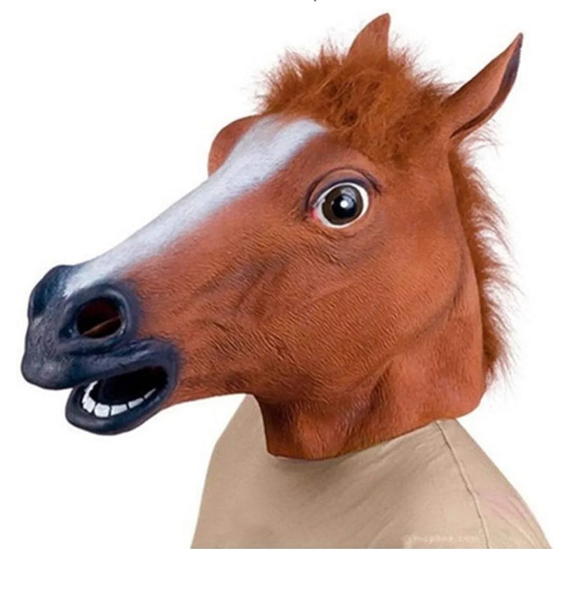 Bu at başı maske, kahverengi yele ve büyük gözlerle gerçekçi detaylara sahip, esnek malzemeden yapılmıştır.
