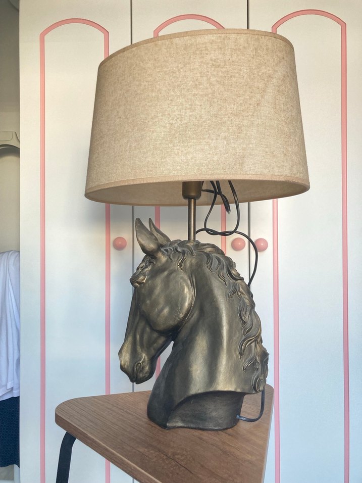 Bej kumaş abajurlu, bronz at figürlü gece lambası abajur Mudo Conseptten alınmıştır