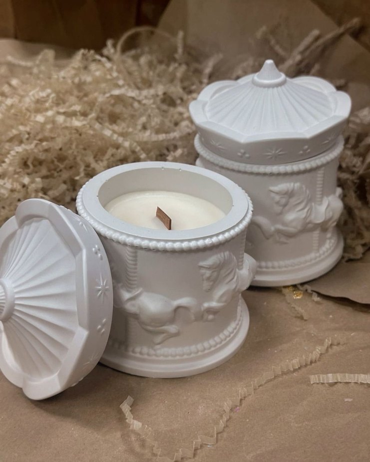 At figürlü beyaz mum, detaylı süslemeli kapaklı kapta. Ahşap fitilli doğal yanış sağlar. ️
