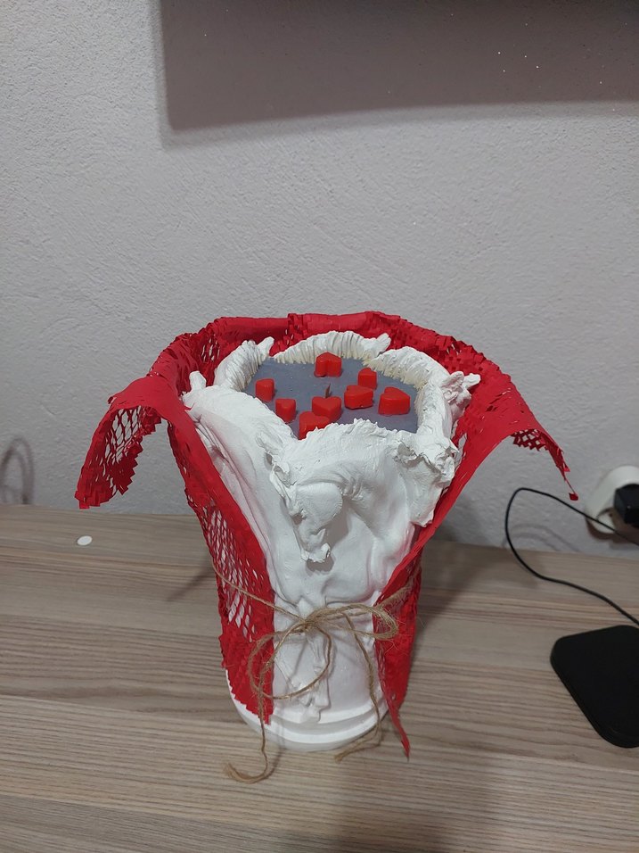 Beyaz at figürü detaylı vazo, kırmızı dantel ve gri detaylarla süslenmiş, doğal ip ile bağlanmıştır. Ürünün at kulak kısmında kırıklar var oyuzden makul fiyat içerisinde soya wax mum bulunmaktadır.