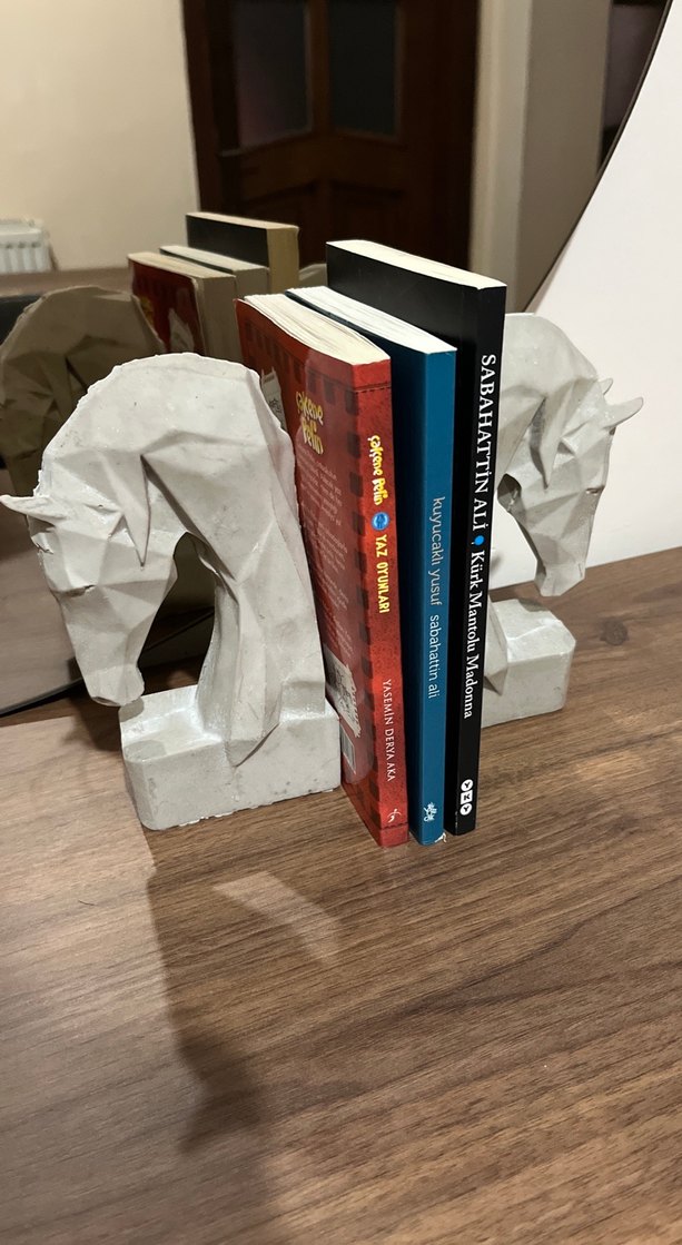 At figürlü, beyaz renkte iki kitap tutucu seti. Üniversite kitaplarını masada dik tutar, hem işlevsel hem dekoratif bir üründür. Sadece biraz tozlu ve atlardan birinin kulağı kırık onun dışında gayet şık ve kullanıma uygundur