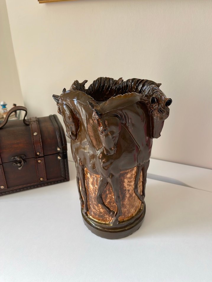 Koyu kahverengi, at figürlü, parlatılmış yüzeye sahip silindirik vazo