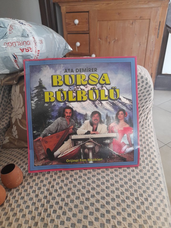 Ata Demirer'in Bursa Bülbülü adlı orijinal film müziklerini içeren, koyu camel renkli bir kutu.