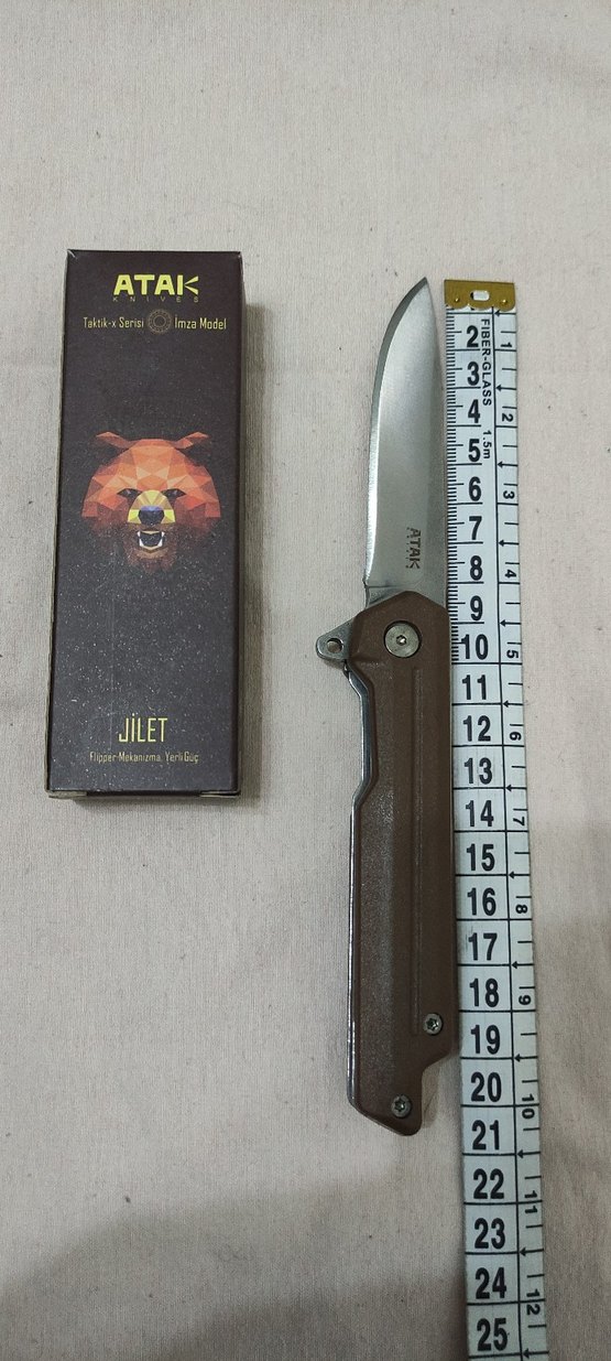 Atak markalı bej katlanır bıçak, keskin bıçağı ve sağlam sapıyla yaklaşık 20 cm uzunluğundadır. ️