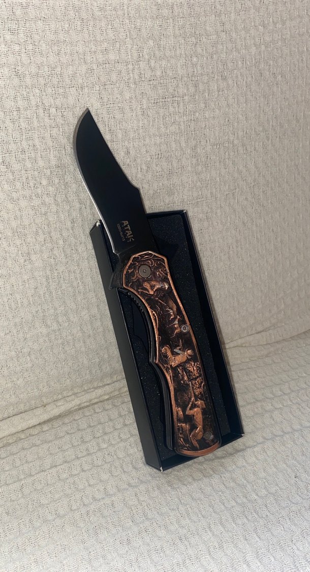 İşlemeli kahverengi sapı ve keskin siyah bıçağı olan katlanır bıçak, çeşitli kesme işleri için uygundur.