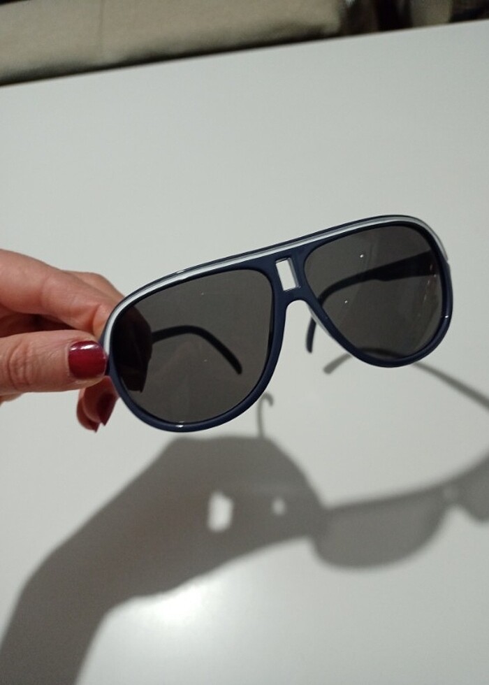 Atasun Optik'ten alınmış sayılı kullanılmış, antrasit gri- beyaz şerit detaylı çocuk güneş gözlüğü. #güneşgözlüğü #çocuk #atasun