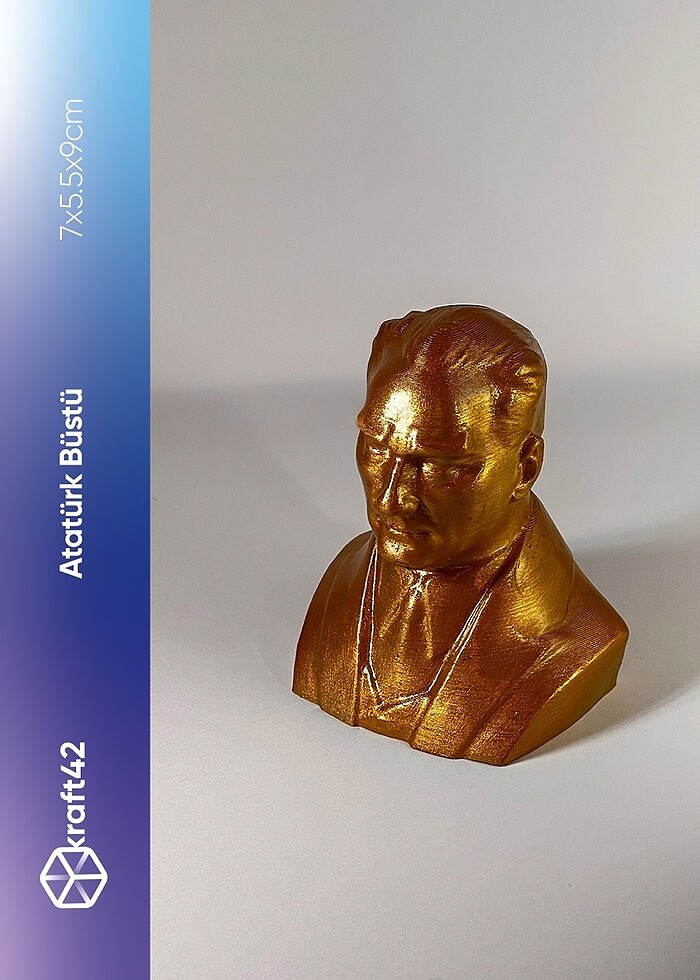 Atatürk Büstü Atatürk büstü, hem tarihe saygı hem de zarif bir dekorasyon sunar. Bu anlamlı eser, çalışma alanınıza ilham verirken, Atamızın mirasını her an hatırlatacak. Ürün Özellikleri Ürün Adı           Atatürk Büstü Ürün Kodu         012 Boyut                  7x5.5x9cm (En-Boy-Derinlik) Materyal             Creality Hyper PLA Renk                   Parlak Gold Ağırlık                 Yaklaşık 50gr Boyama              Nova Color Gold Kaplama             ArtDeco Ekstra Parlak Vernik Ürünler kişiye özel üretildiğinden dolayı ufak gecikmeler yaşanabilir. Kargoda oluşabilecek hasarları doğrulayabilmek için lütfen paketinizi açarken video kaydı alınız.