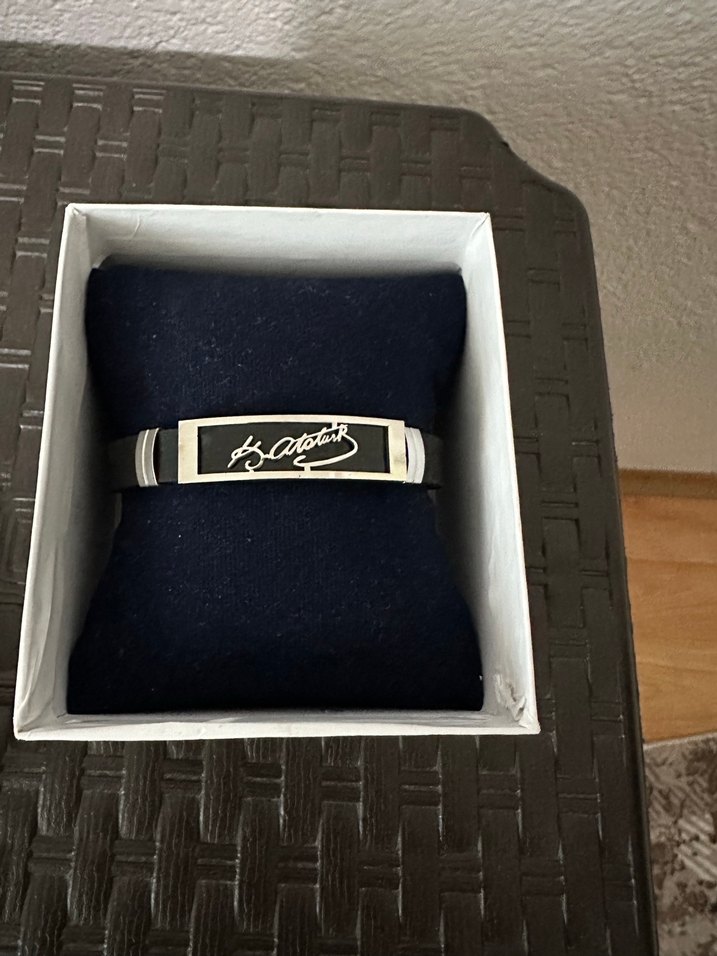 Ürün hiç kullanılmadı. Atatürk fotoğraflarının olduğu güzel kutusuyla gönderilecektir. Erkek bilekliği, siyah renkte ve imza detaylıdır. Street wear tarzıyla klasik iş şıklığını bir araya getirir.