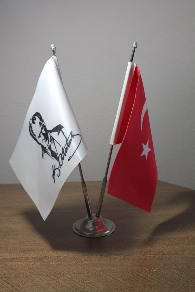 Türk bayrağı ve Atatürk'ün portresi ile imzasını taşıyan beyaz bayraktan oluşan metal standa monte edilmiş masa bayrağı seti.