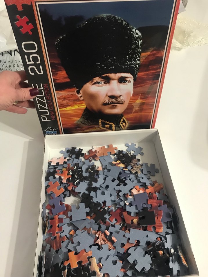 250 parça Atatürk puzzle. Hiç yapılmadı. Sadece jelatini açıp baktı oğlum. Parçaları eksiksizdir.Son fiyattır.