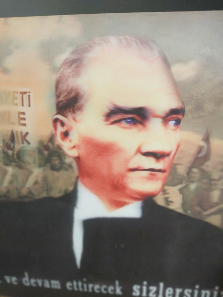 Atatürk portresi ve arka planda kalabalık figürleri bulunan erkek maskesi. Üzerinde Türkçe yazı yer almaktadır. ️