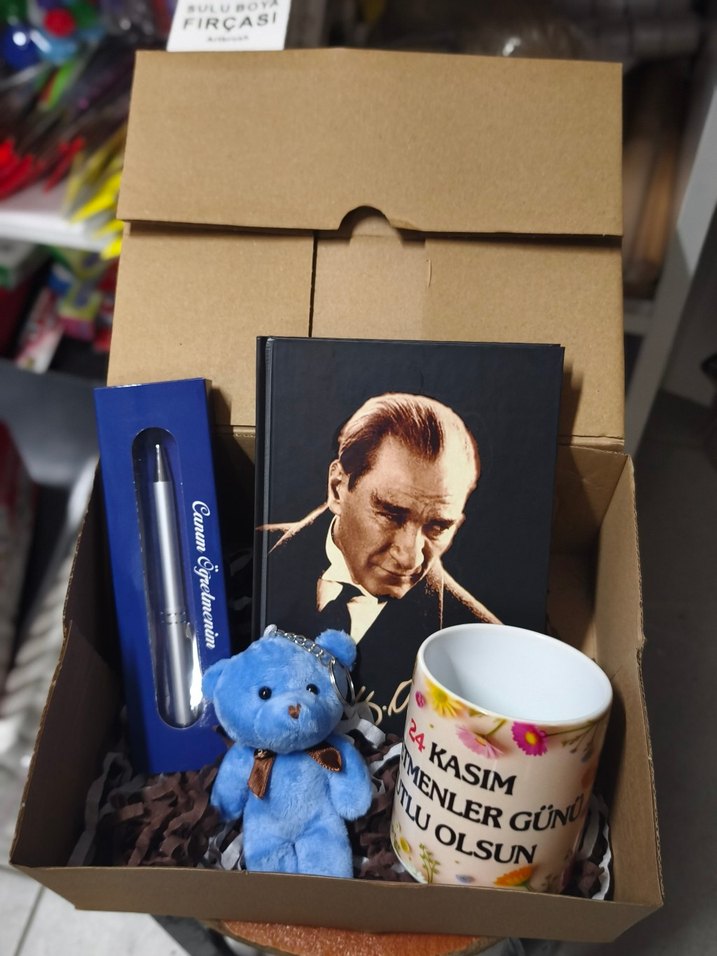Atatürk görselli defter, kalem, küçük mavi ayıcık ve '24 Kasım Öğretmenler Günü Kutlu Olsun' yazılı çiçekli kupa içeren hediye kutusu.