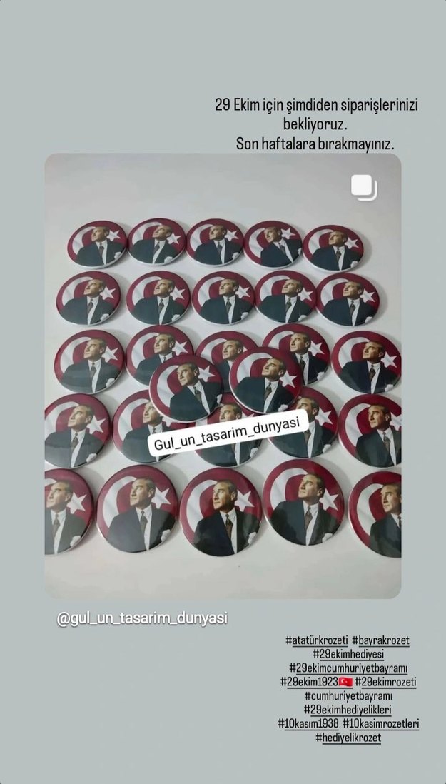 Atatürk görselli koyu kırmızı rozetler, Türk bayrağı önünde tasarlanmıştır. Anma ve milli bayramlar için uygundur.