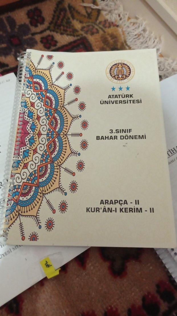 Atatürk Üniversitesi 3. sınıf bahar dönemi için hazırlanmış Arapça II ve Kur'an-ı Kerim II konularını içeren kitap. Kapakta dekoratif desenler bulunur. Eski basım yardımcı kitabı içinde notlar ve altı çizilmiş kelimeler var