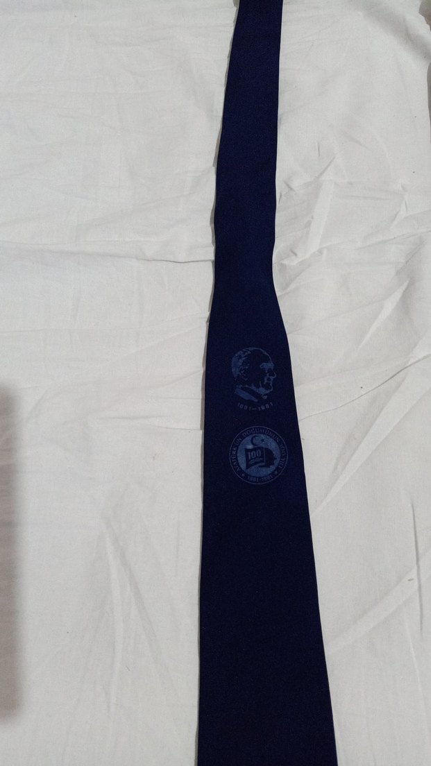 Lacivert erkek kravat, üzerinde yuvarlak amblem baskılarıyla farklı bir dokunuş katıyor. Atatürk'ün 100. doğum günün hatırası olan özel kravat. İnce kumaştır. Baskısı renkten dolayı biraz silik. Alıcısına şimdiden hayırlı olsun.