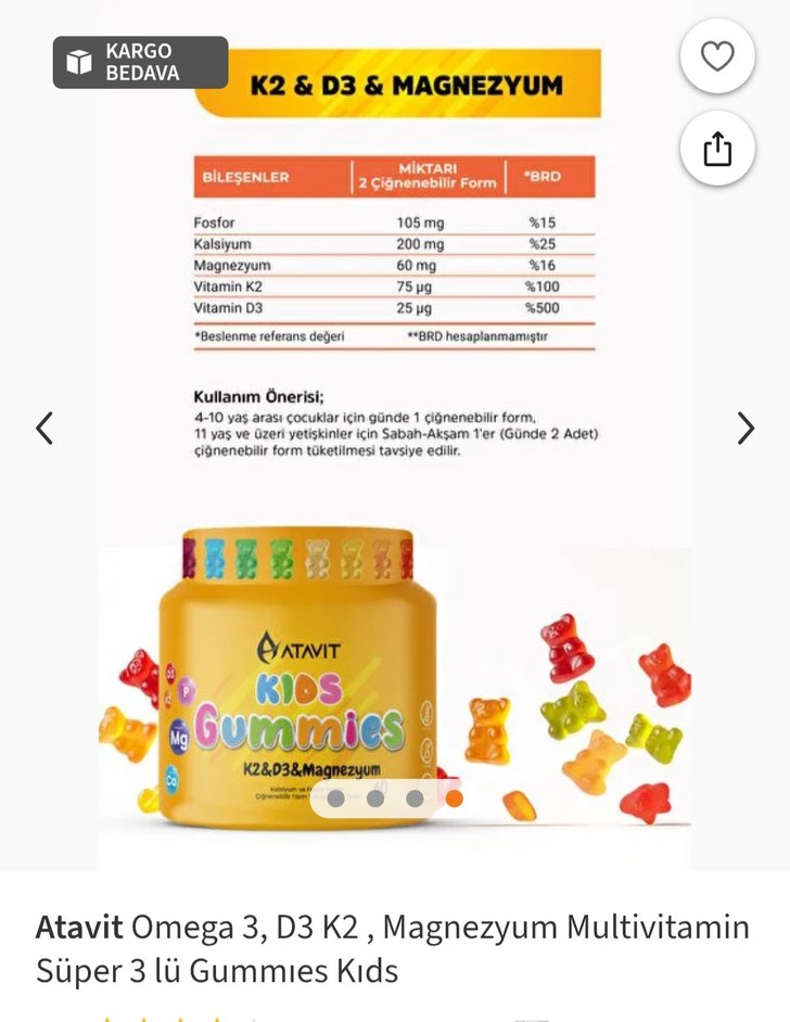 4-10 yaş çocuklar için Omega 3, D3, K2, magnezyum, kalsiyum ve fosfor içeren multivitamin gummies. 11 yaş üzeri için de önerilir.