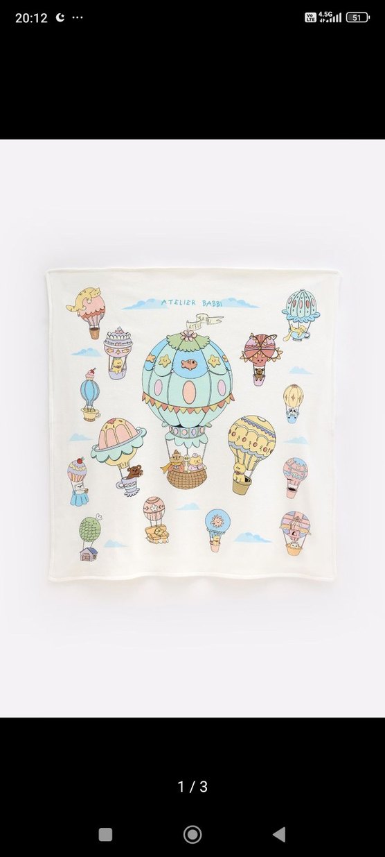 Pamuk kumaştan yapılmış, pastel renklerde ve çok renkli sıcak hava balonları desenli çocuk battaniyesi.
