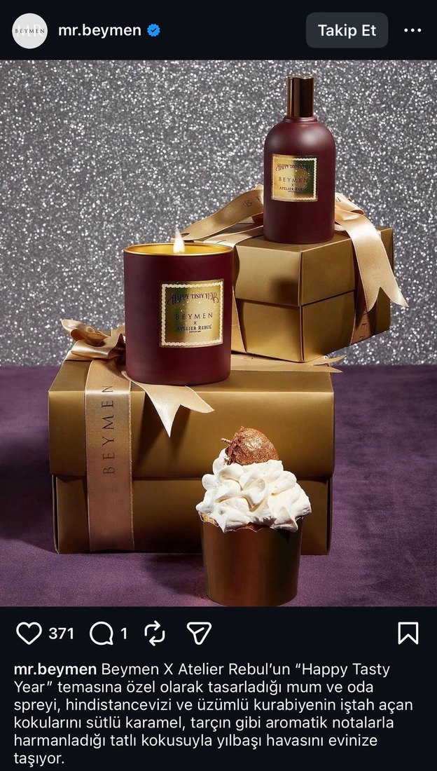 Atelier Rebul'un "Happy Tasty Year" teması için özel olarak tasarlanmış, parlak altın ambalajlı mum ve oda kokusu seti.