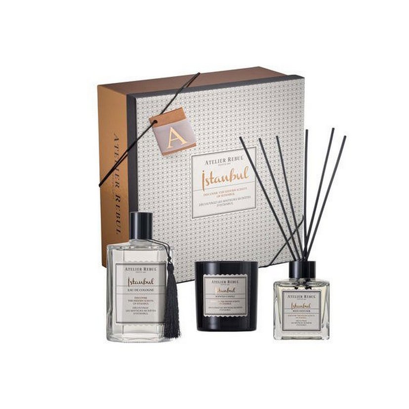 Atelier Rebul İstanbul kadın parfüm seti; kolonya, kokulu mum ve çubuklu oda spreyi içerir, şık kutuda sunulur.