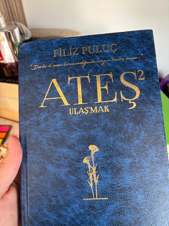 Filiz Puluç'un Ateş 2 Ulaşmak adlı romanı, altın harflerle yazılmış başlık ve çiçek illüstrasyonlu mavi dokulu kapak içerir. ciltlidir