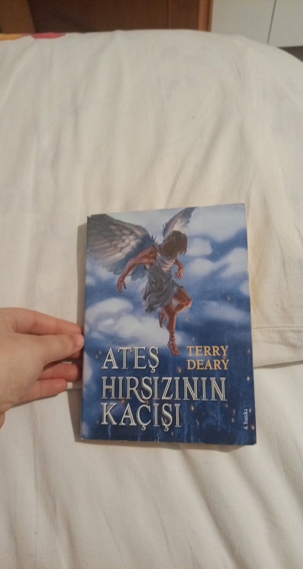 Terry Deary'nin "Ateş Hırsızının Kaçışı" adlı romanı, bulutlu bir gökyüzünde melek figürüyle dikkat çekiyor. Sürükleyici bir hikaye sunuyor.