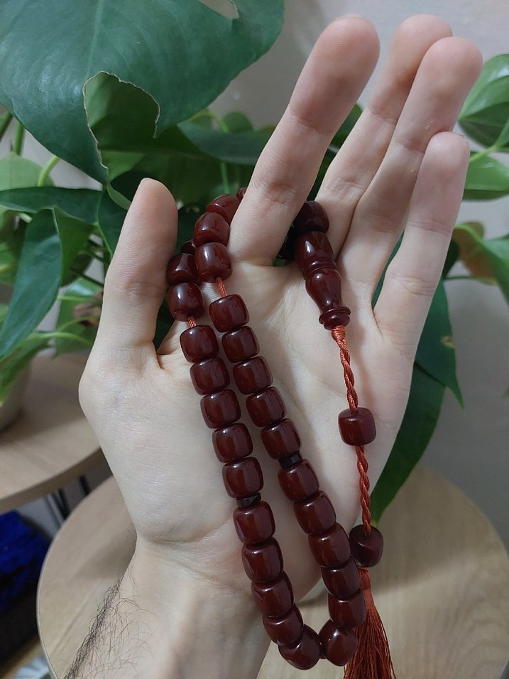 Koyu bordo renkte, klasik ates kehribar Kalite kusursuz ve hatasiz eski bir tesbihtir Yıllanmıştır İri habbeli ve sistemli