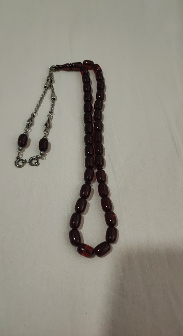 Koyu bordo renkli, klasik tarzda ve minimalist tasarımlı erkek tesbih. Pürüzsüz boncuklar, gümüş renkli zincir ve kancalarla bağlanmıştır. ✨