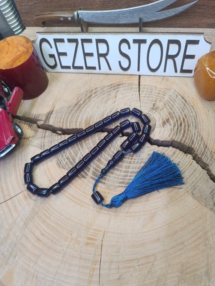 parlement mavisi rengiyle muhteşem bir şaheser ip püskül tasarımlı kapsül kesim ateş kehribar tesbih ölçü 9x10,5