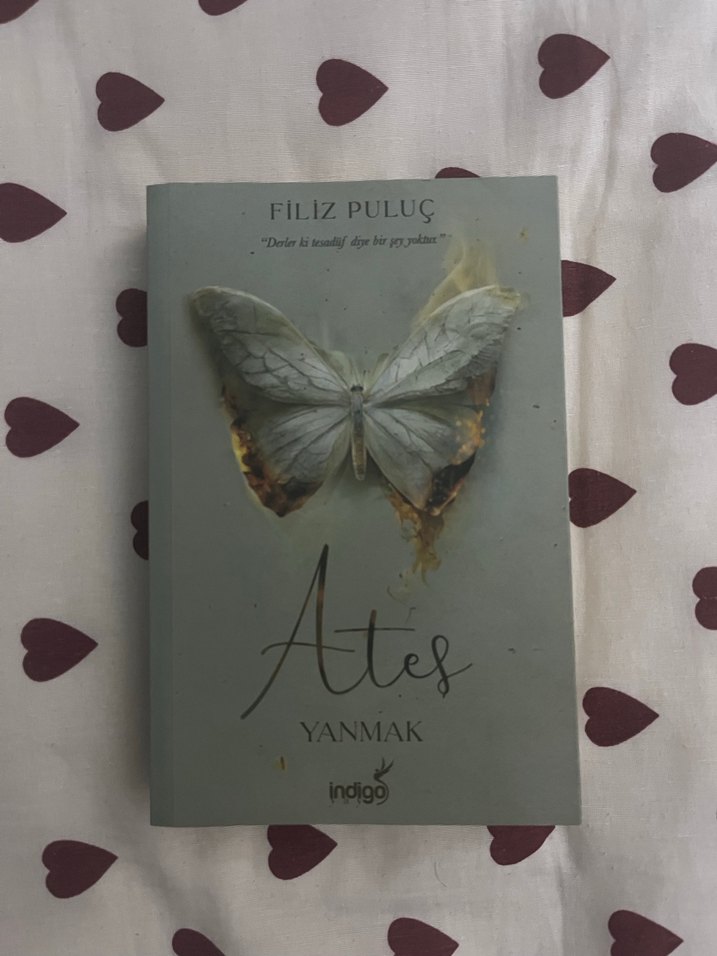 Filiz Puluç'un "Ateş Yanmak" adlı romanı, detaylı kelebek çizimiyle kaplanmış. Dönüşüm ve içsel ateş temalarını işliyor.