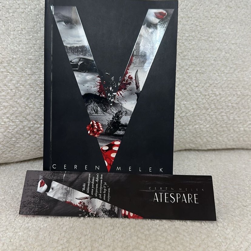 Ceren Melek'in "Ateşpare" romanı, içinde araba, motosiklet ve kırmızı lekeler bulunan büyük "V" harfiyle dikkat çekiyor. Sürükleyici bir hikaye sunuyor.