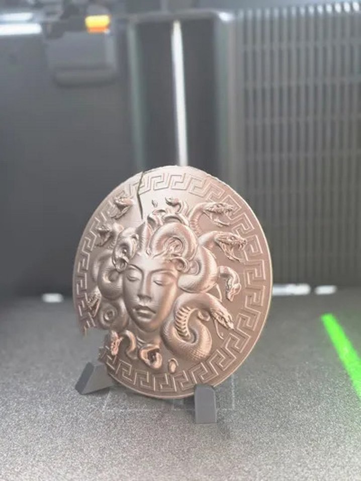 Metalik altın renkli, parlak yılan desenli kadın broş, avant-garde Medusa tasarımıyla trend belirleyiciler için düğünlerde kullanıma uygun. Athena kalkan 30 cm.renklendirme yapılır altın bronz gümüş