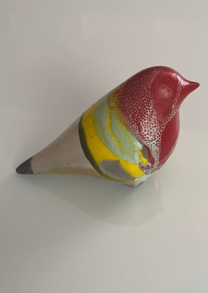 Kırmızı, sarı ve açık mavi tonlarda renkli kuş figürü. Parlak ve pürüzsüz yüzeye sahip, kompakt tasarım. Kuşlarında kullandığı seramik pişirim tekniği olan “Raku Tekniği” Japonya'da keşfedilmiştir. 9 cm x 12 cm x 5 cm