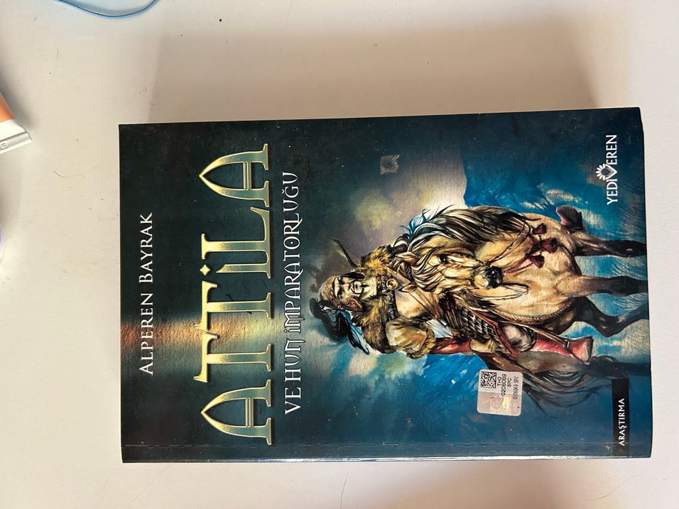 "Atilla ve Hun İmparatorluğu" adlı kitap, Atilla ve Hunların tarihini ve mitolojisini anlatıyor. Kapakta detaylı bir illüstrasyon bulunuyor.
