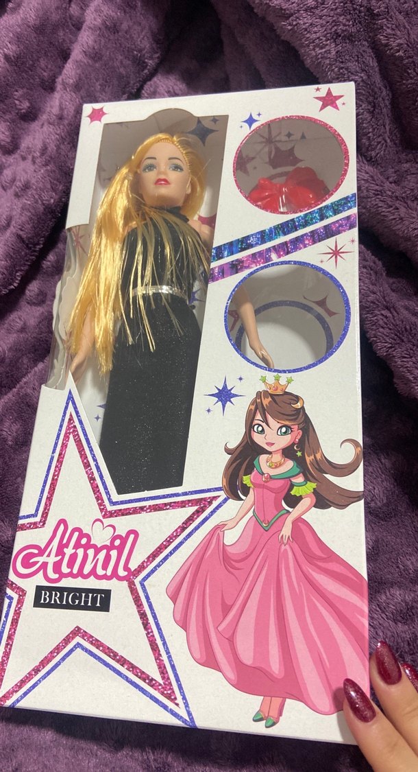 Atinil Bright bebek, uzun sarı saçlı ve siyah kıyafetlidir. Kutuda parlak pembe ve yıldız desenleri bulunur. Kutuda "BRIGHT, Htinil" yazısı vardır.
