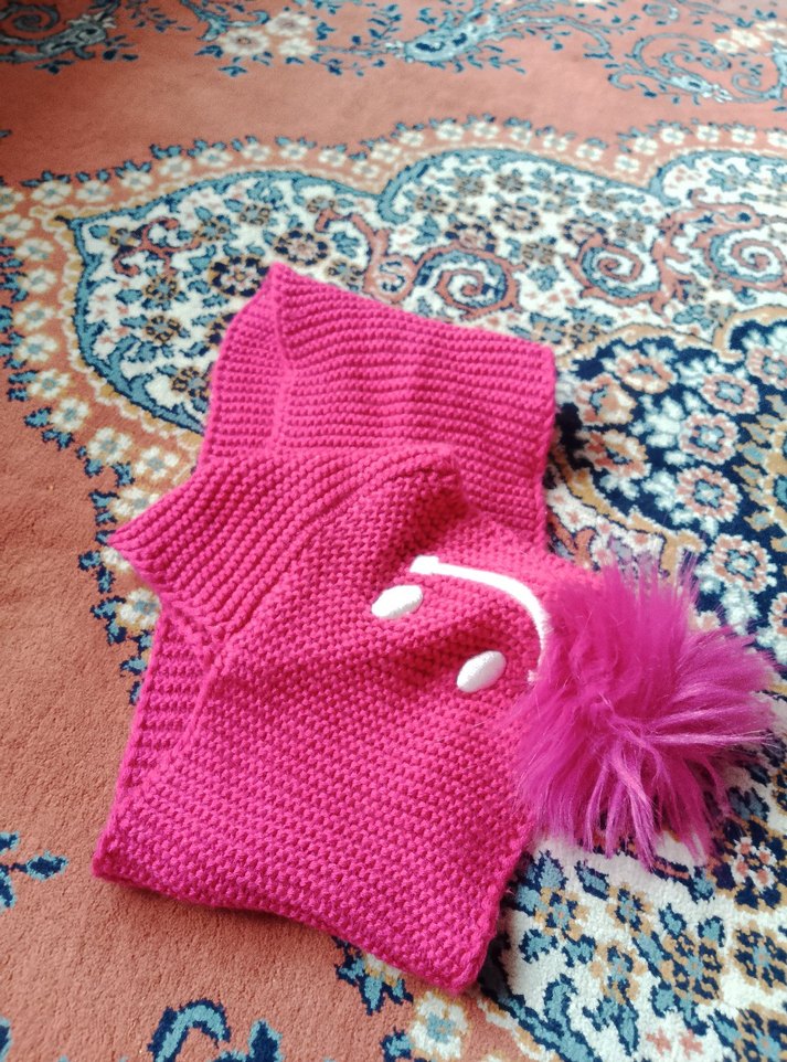 Renkli pembe örgü çocuk bere ve atkı seti, nakışlı detaylar ve tüylü ponpon ile dikkat çekiyor.
