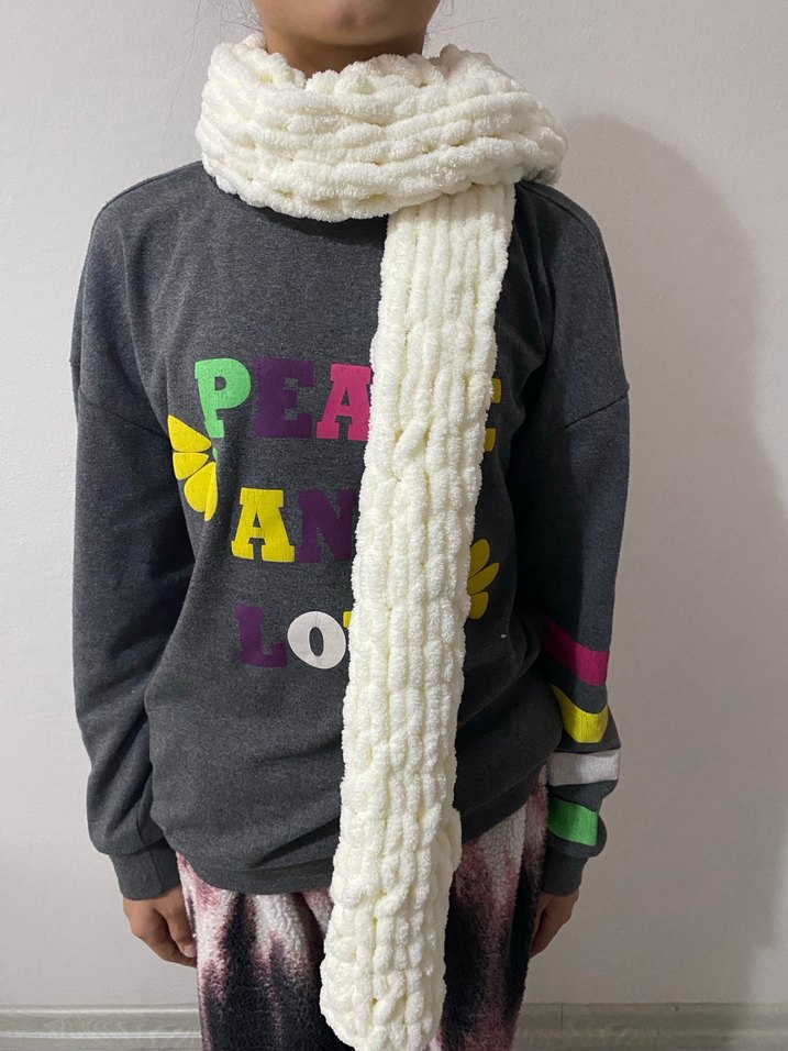 Yumuşak örme kumaştan yapılmış beyaz kadın atkısı, rahat ve şık sokak stili için uygundur. Günlük kıyafetlere sıcaklık ve stil katar. İstenilen renk ve ölçüde yapılır.