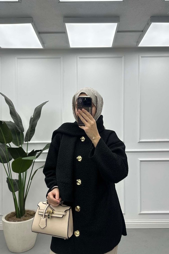 Düğmeli, siyah midi uzunlukta, bol kesim kadın kabanıdır. Notlu yakalı ve uzun kolludur, yumuşak ve sıcak kumaştan üretilmiştir, günlük kullanım için uygundur. Sıfırdır etiketi üstündedir XL bedendir