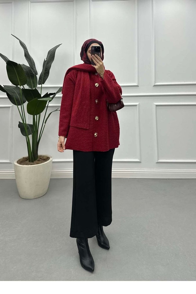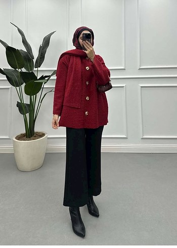 Bordo renkte, yün kumaştan yapılmış, düğmeli, normal kesim ve midi boy uzunluğunda kadın kabanı. Günlük kullanıma uygundur. Sıfırdır etiketi üstündedir