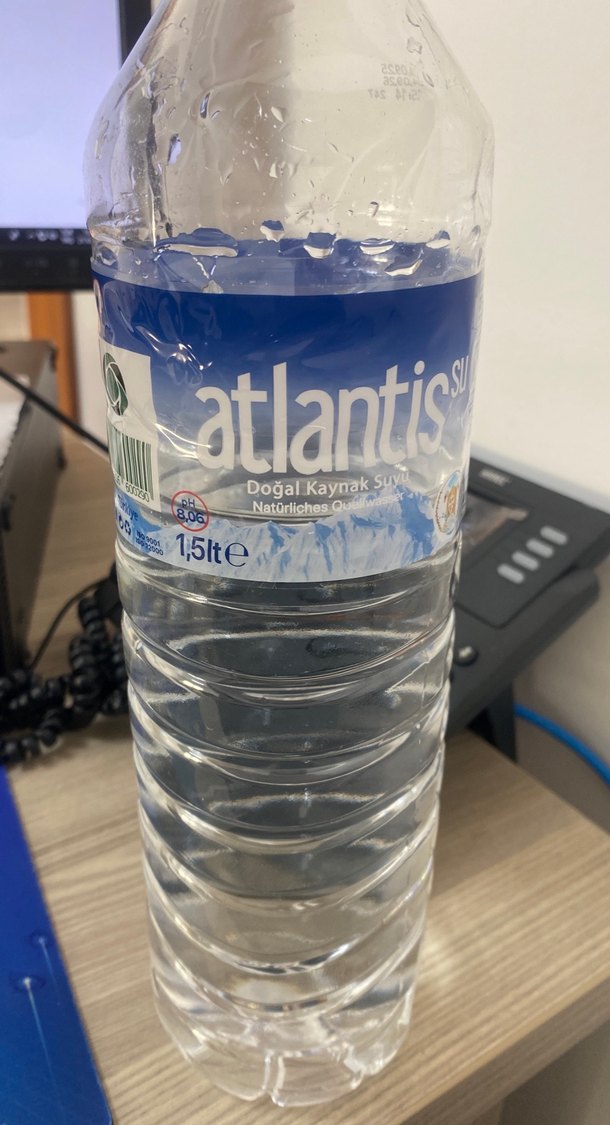 Atlantis doğal kaynak suyu, 1,5 litrelik şeffaf ve koyu mavi etiketli şişede. Kolay tutuş için kabartmalı şişe tasarımı ve taze su içerir.