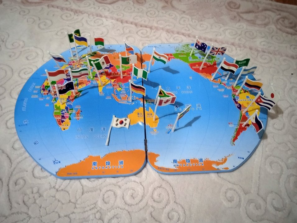 ahşap dünya haritası plastik bayraklar takılıp çıkıyor. çocuklara ülkeri oyun oynayarak öğretebileceğiniz bir set. kalitelidir. bikaçtane bayrağı eksik bilerek alım yapınız