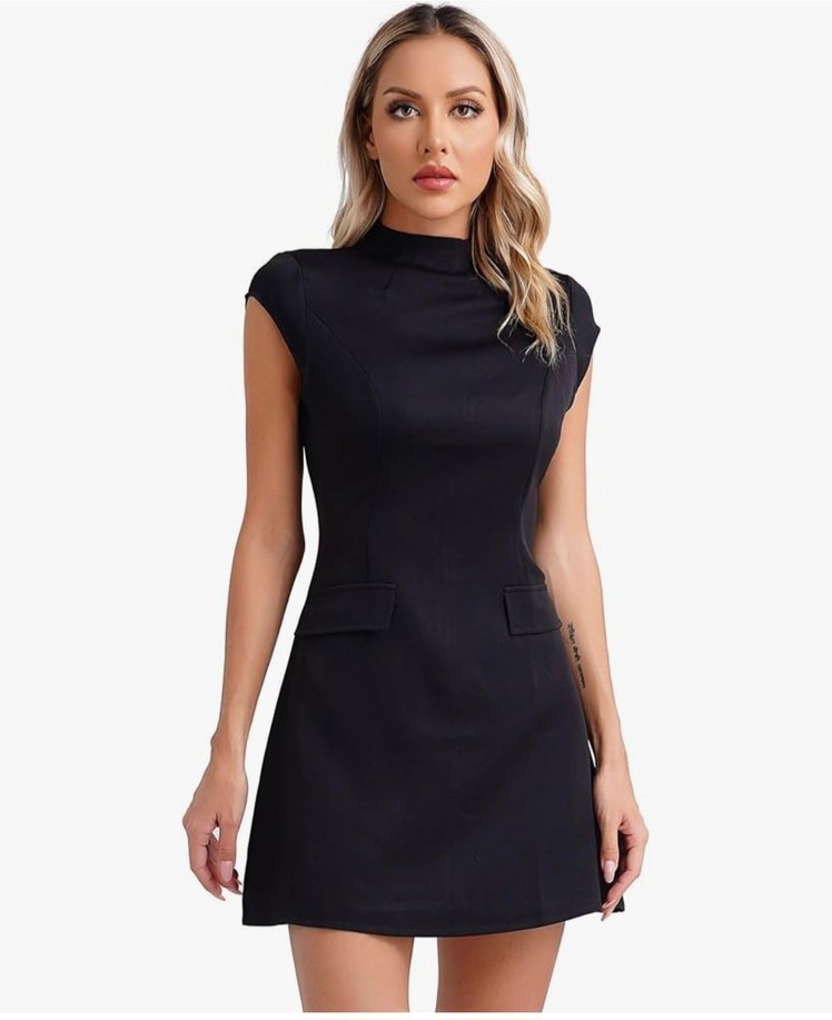 Siyah, yüksek yakalı ve kolsuz bu kalem elbise, düz ve şık tasarımıyla ofis ve günlük kullanıma uygundur. Rahat sentetik kumaştan üretilmiştir.