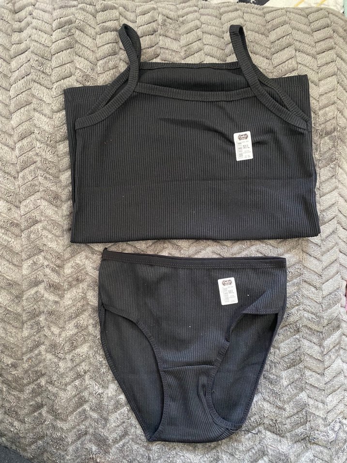Siyah renkli, ince askılı ribanalı atlet ve uyumlu ribanalı külot içeren rahat ve sade kıztakımı.