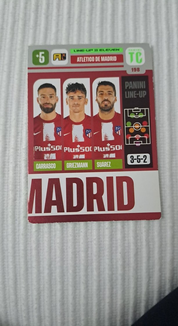 Koyu kırmızı renkteki erkek rozeti, Atletico Madrid oyuncuları Carrasco, Griezmann ve Suarez ile 3-5-2 dizilişini gösterir. Panini Line-Up koleksiyonundan önemli detaylar içerir. ⚽