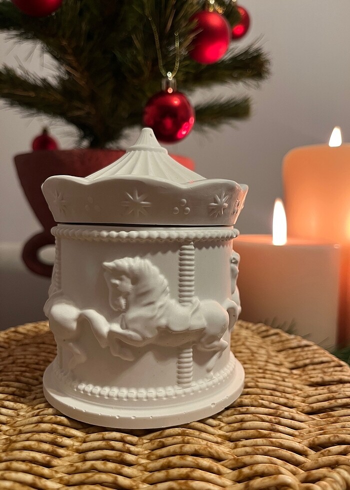 Kapaklı atlıkarınca kutusu isterseniz dekoratif olarak kullanabilirsiniz isterseniz içerisine mum koyarak mumluk yapabilirsiniz Boy 12 cm En 9 cm