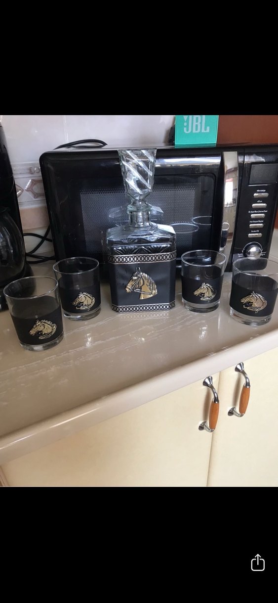 Atlı desenli, siyah camdan yapılmış viski seti. Bir sürahi ve dört bardaktan oluşur, şık ve koyu renklidir. Ürün 55 yıllık antika değerinde. Doğubeyazıt’tan getirilmiştir.