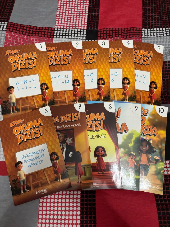 Atom Okuma Dizisi, sayılar, tekerlemeler ve bayramlar gibi konuları içeren 10 çocuk kitabından oluşur. Her kitap renkli illüstrasyonlarla basit öğrenme temaları sunar.