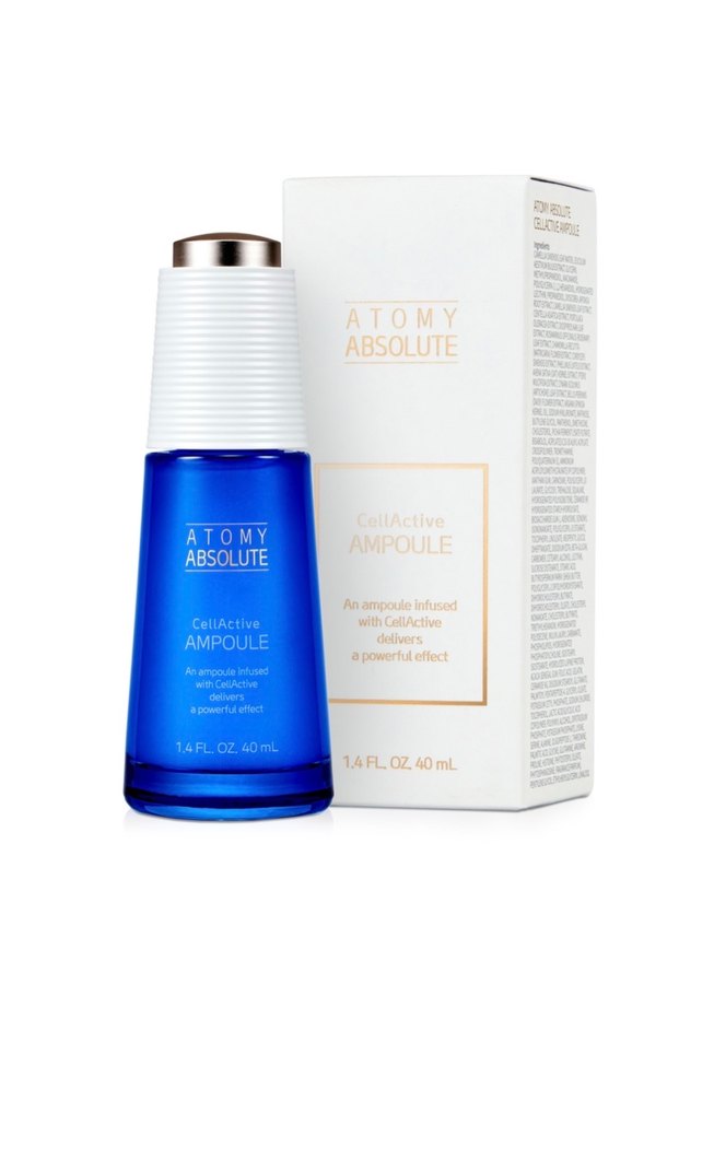Atomy Absolute CellActive Ampoule, cilt gençleştirici güçlü etki için CellActive ile zenginleştirilmiş 40 ml serum. Mavi şişede, beyaz kapaklı.
