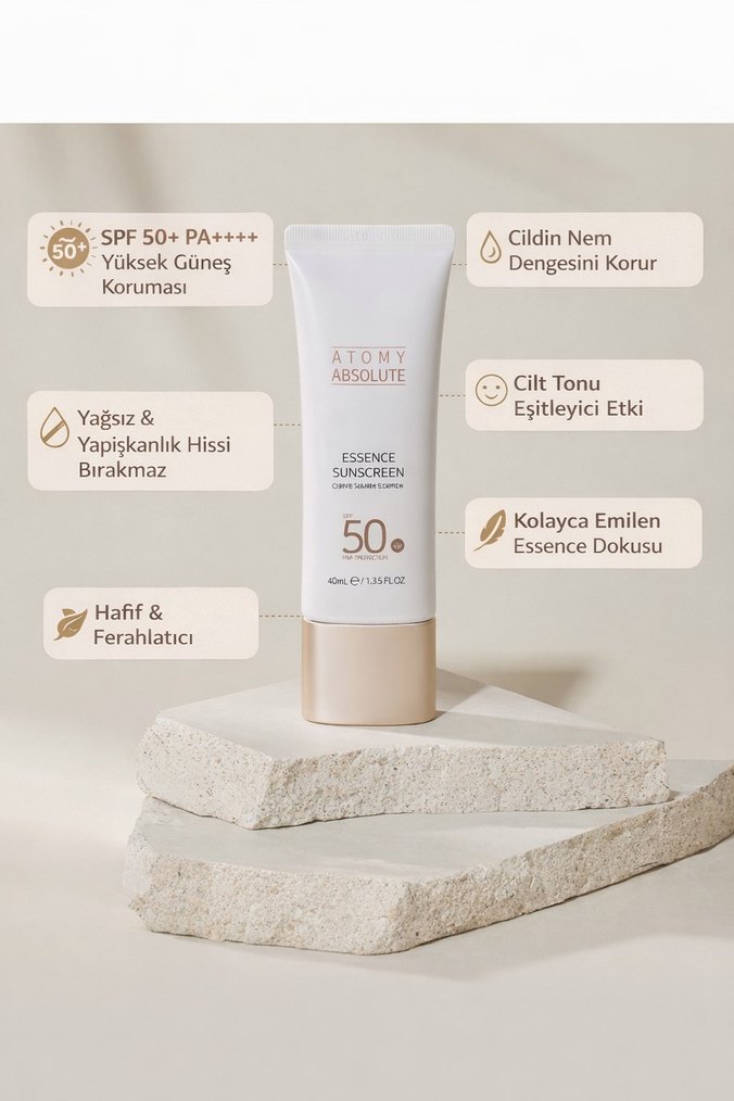 Atomy Absolute Essence Güneş Koruyucu SPF50+ yüksek güneş koruması sağlar. Cildin nem dengesini korur, cilt tonunu eşitler. Hafif, ferahlatıcı ve yapışkanlık bırakmayan essence dokusu kolayca emilir.