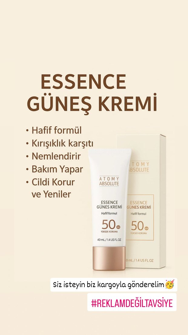 Atomy Absolute Essence güneş kremi, hafif formülüyle kırışıklık karşıtı, nemlendirici ve bakım sağlar. SPF 50 ile cildi korur ve yeniler. ☀️ 1350tl altı 100 tl kargo ücreti